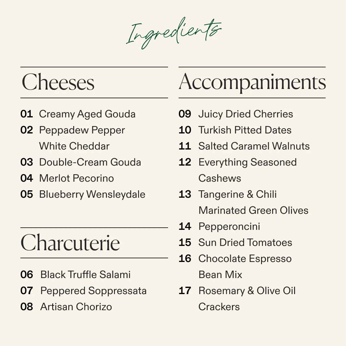 - 17 hand-selected artisan cheeses, meats, dried fruits, nuts, chocolates and olives