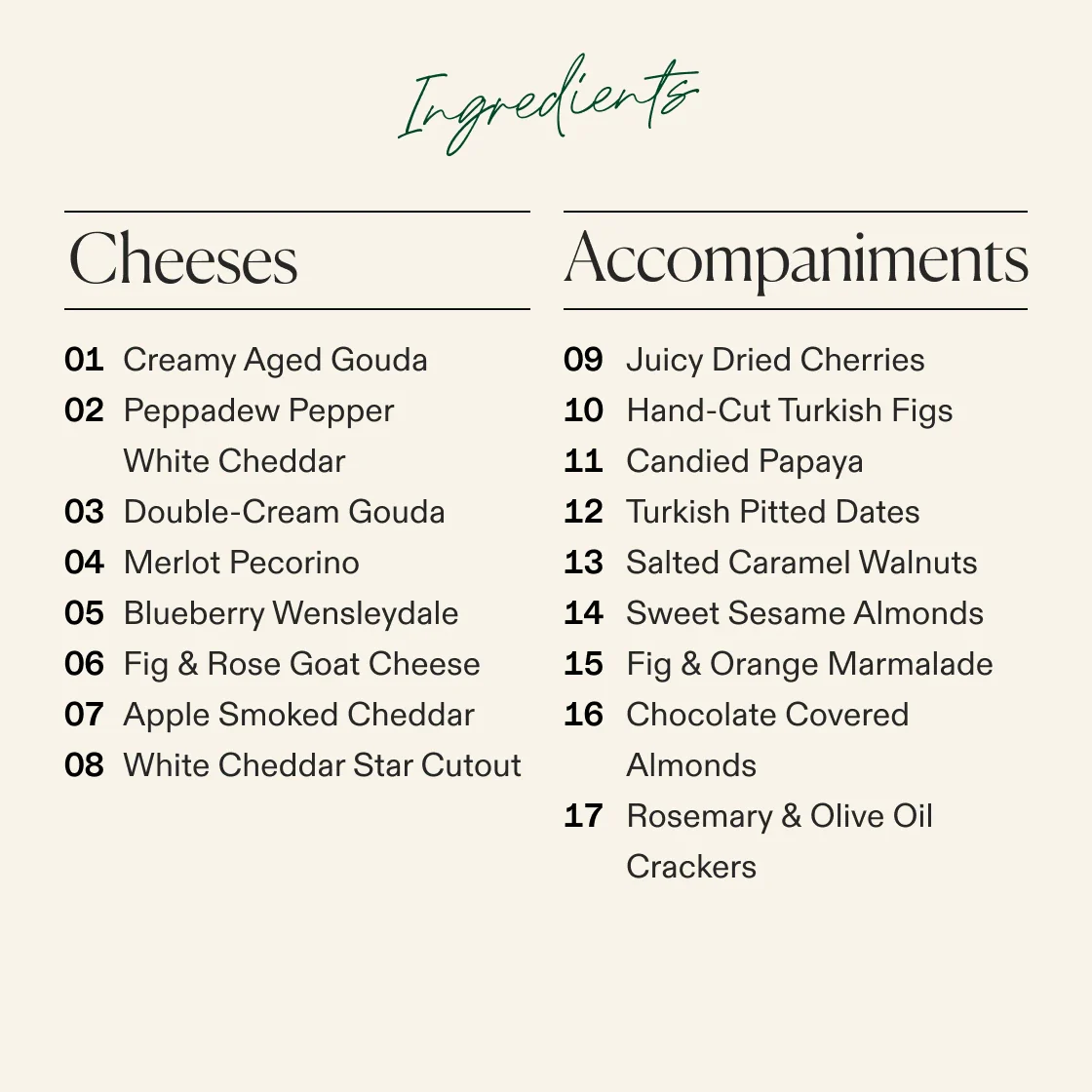- 17 hand-selected artisan cheeses, dried fruits, nuts, chocolates and jam